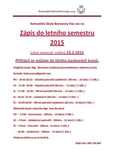 Seznamte se s nabídkou jazykových kurzů na letní semestr 2015, přihlásit se můžete na tel. č. 604 736 064, emailu ksborovany@gmail.com nebo online přihlášce.